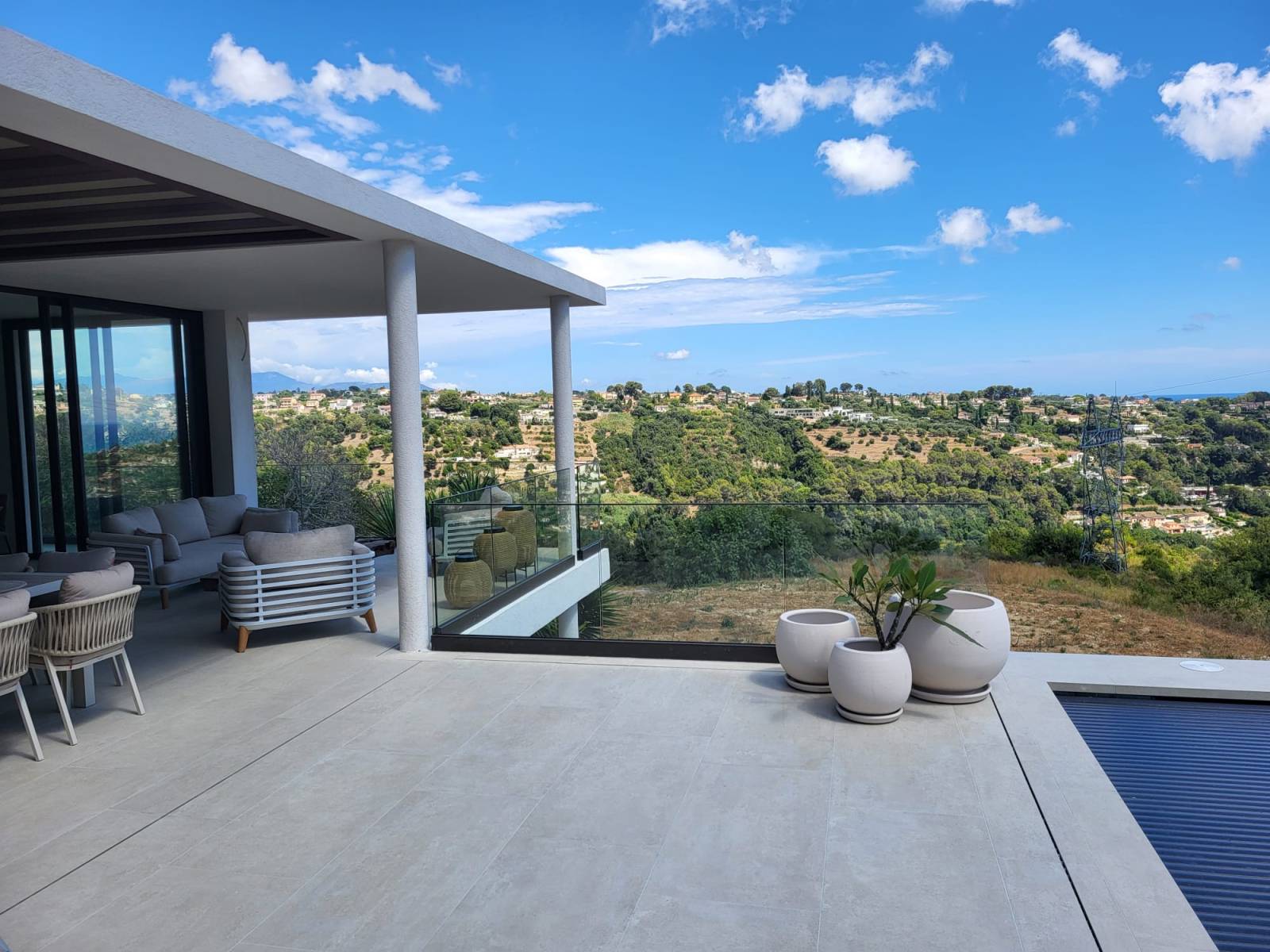 Sur les hauteurs d’Antibes, cette villa de standing bénéficie d’un environnement exceptionnel et de vues dégagées. Pour préserver pleinement ces perspectives tout en assurant la sécurité de la terrasse, Azur Alu a réalisé la fabrication et la pose de garde-corps vitrés sur mesure, conçus pour s’intégrer avec élégance à l’architecture du projet.