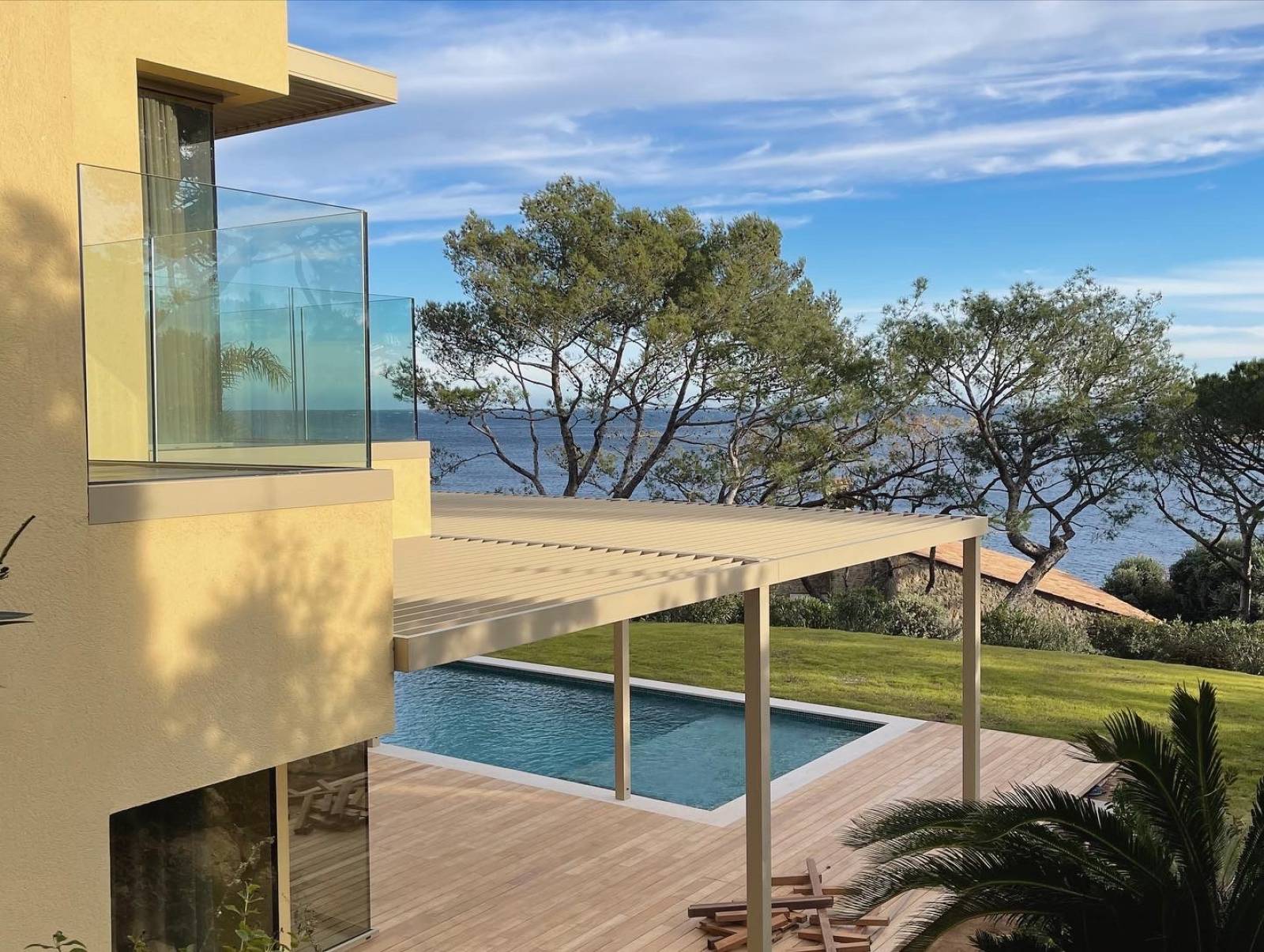 Pour cette réalisation au Cap d'Antibes, le client à décidé, d'accorder la couleur de sa pergola bioclimatique à celle de sa façade. Les pergolas bioclimatique de la marque Profils Système vous offrent un